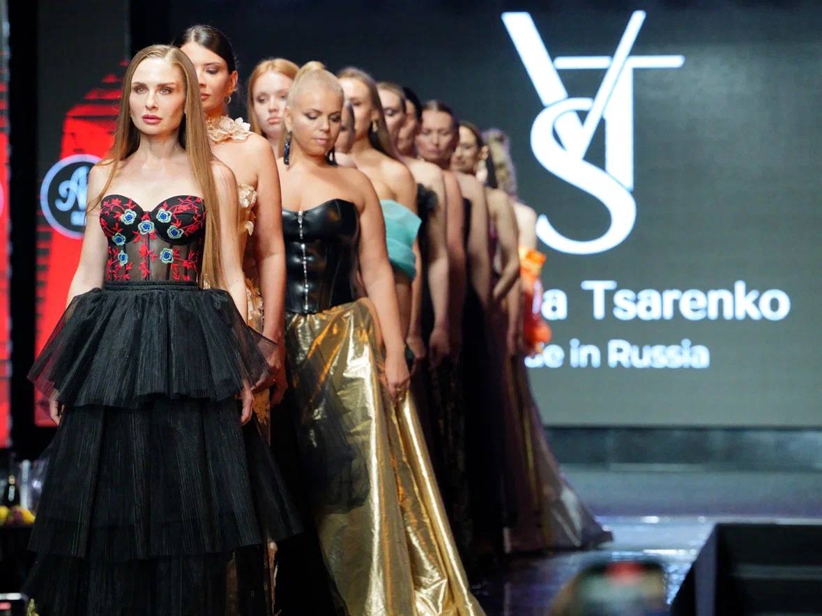 Марина Жарова (бренд «Marianne Moore») представила захватывающую новую коллекцию, очаровавшую зал изысканными вечерними нарядами в королевском стиле.